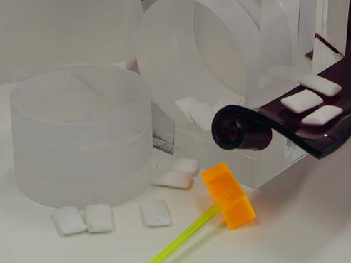 Der Hauptkörper ist eigentliche Träger und steht als "mächtiger" Block im Raum. Die Kaugummis befinden sich im innern dieses Blockes und werden mit einem Schieber gehalten. Um einen Kaugummi zu "lösen" wird die Trommel gedreht und schon rutscht ein Kaugummi auf den roten Akryl-Tisch. Sollte das Lager verstopft sein kann dies mit dem gelben Stick wieder behoben werden.