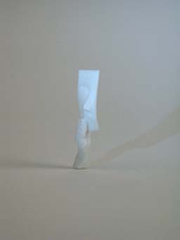 Als ob die Figur nachdenken würde, wird die Maske von der Hand gehalten. Diese 7.3 cm kleine Corian Figur entstand aus intresse zum Material.